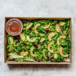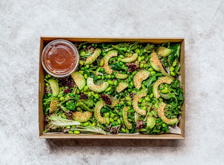 Garden peas, fresh avocado, and edamame beans in a ginger, coriander, and lime dressing, finished with sesame seeds and coriander. -