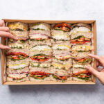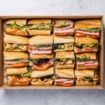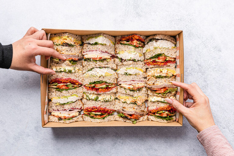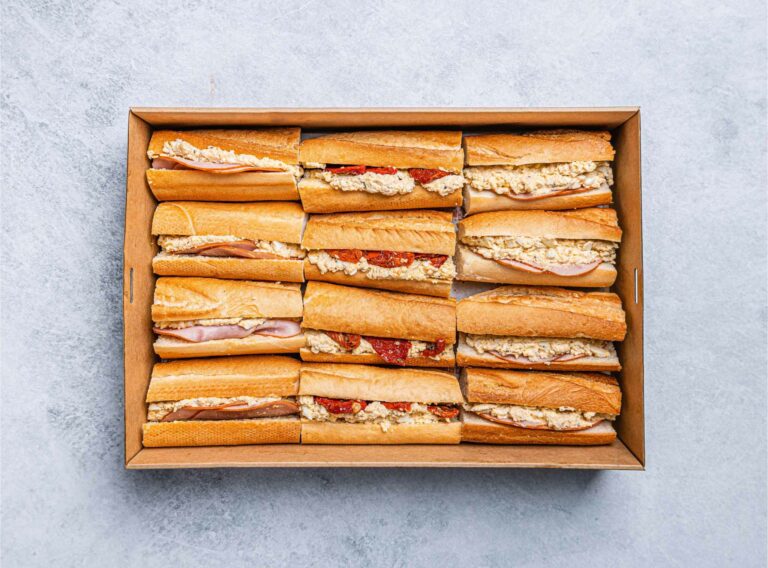 An assortment of our fresh and handmade sandwiches, wraps, and baguettes with quality gourmet fillings including vegetarian options. Each person receives one and a half sandwiches, wraps or baguettes, which translates to approximately 4 to 5 pieces per person. -