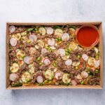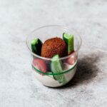 Falafel, shredded beetroot, cucumber, mint, radish, red onion, beetroot tahini dip, and mixed lettuce with a balsamic and olive oil vinaigrette dressing. REGULAR: Serves up to 10 people as a side. SMALL: Serves up to 4 people as a side.