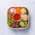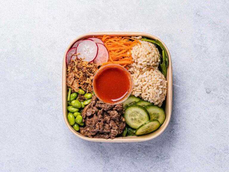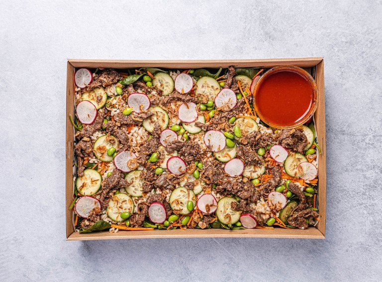 Brown rice, beef strips, shallots, crispy shallots, cucumber, edamame, sliced radish, shredded carrot, spicy gochujang dressing, spinach leaves. -