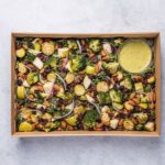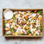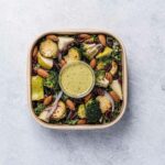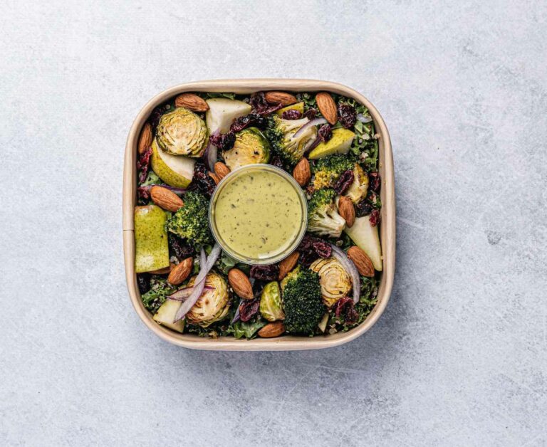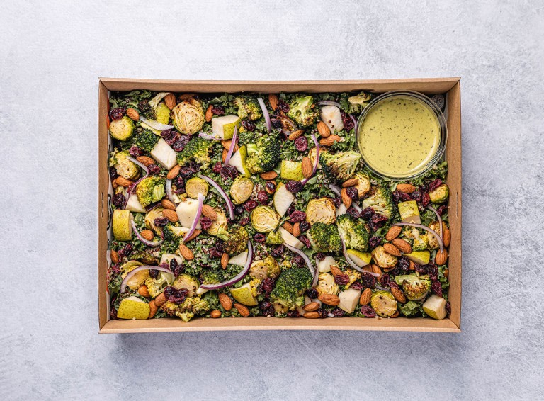 Roasted broccoli and brussels sprouts with olive oil, marinated spiced chickpeas, freshly cut pears, kale, quinoa, red onion, almonds and currants with a green goddess dressing. -