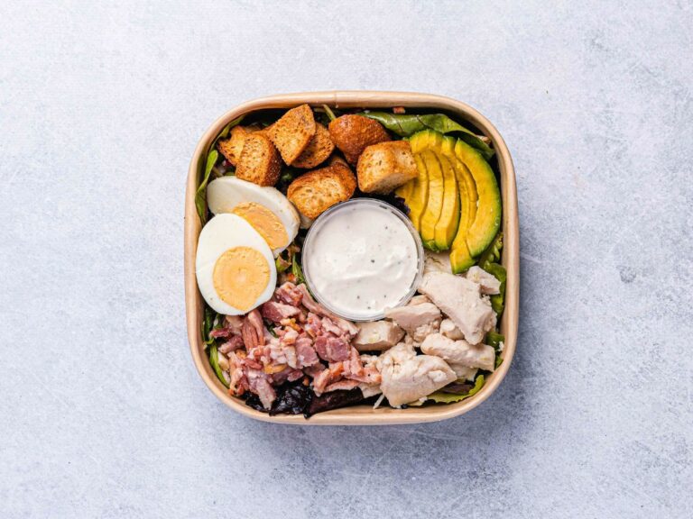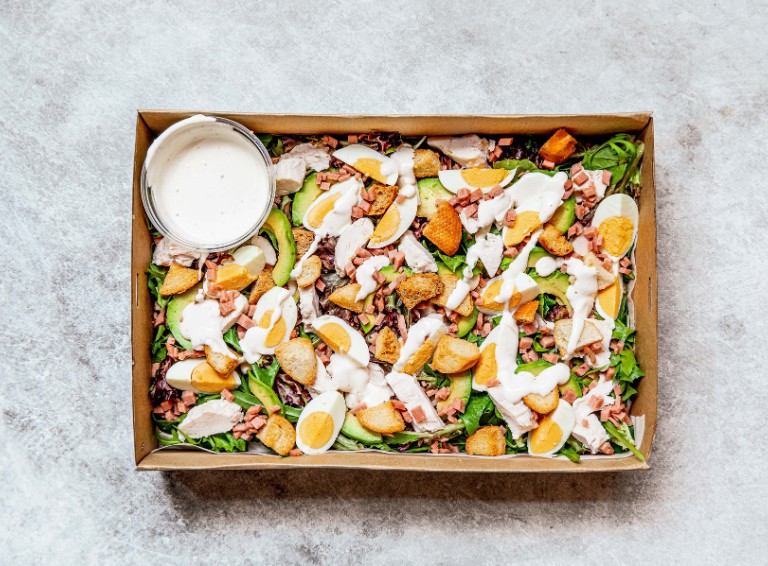 Shredded poached chicken, crispy bacon, boiled egg, olive oil croutons, avocado, and mixed lettuce with a creamy caesar dressing. -