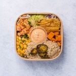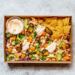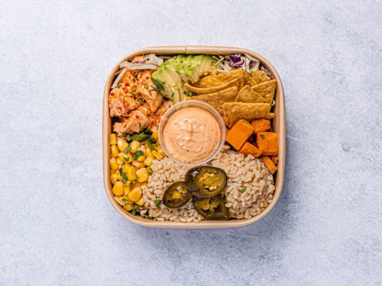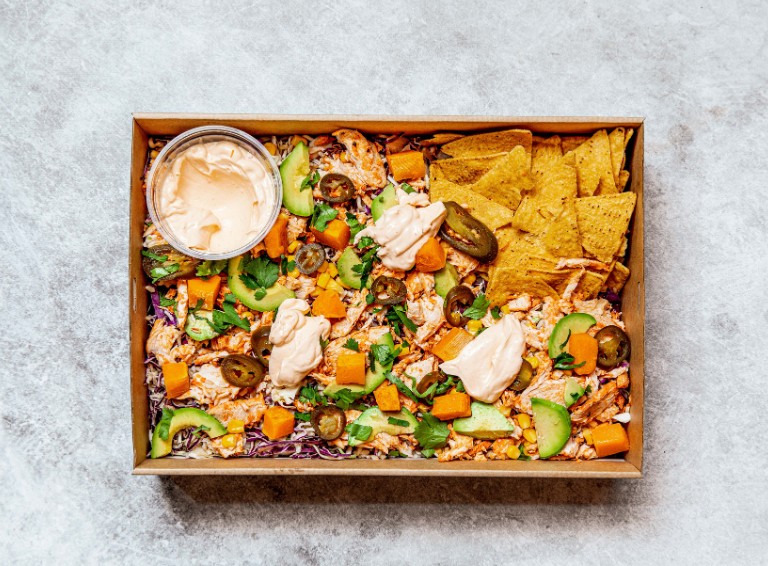 Roasted Peri-Peri chicken, avocado, brown rice, sweet corn, pickled jalapenos, crispy tortillas, roast pumpkin, coriander, shredded cabbage with spicy chipotle mayo. -