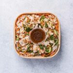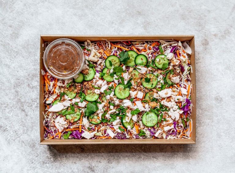Roasted shredded chicken, cucumber, shredded carrot, vermicelli noodles, shredded cabbage, coriander, mint, crispy shallots, topped with a Japanese style dressing. -
