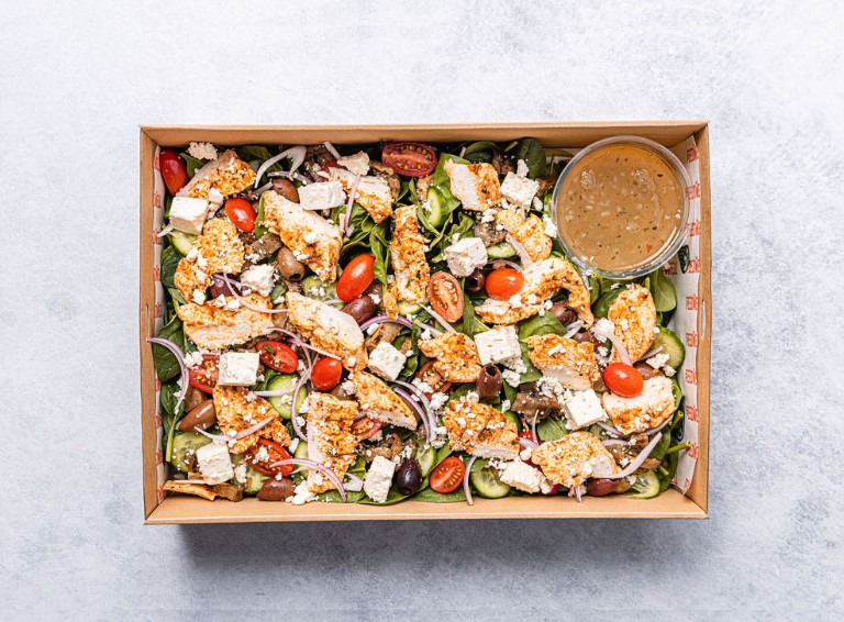 Lemon herb poached chicken, kalamata olives, baby spinach leaves, red onion, cherry tomatoes, feta, dried oregano, cucumber, grilled eggplant, and greek lemon dressing.