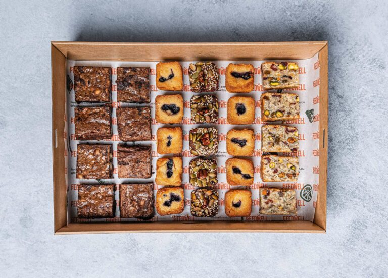 Our most popular morning and afternoon tea sweet treats, all in the one platter. Each platter includes: 4 x Chocolate Macadamia Brownies. 5 x Blueberry Bites. 5 x Fignut and Grain Bites. 5 x Pistachio & Coconut Bites. -