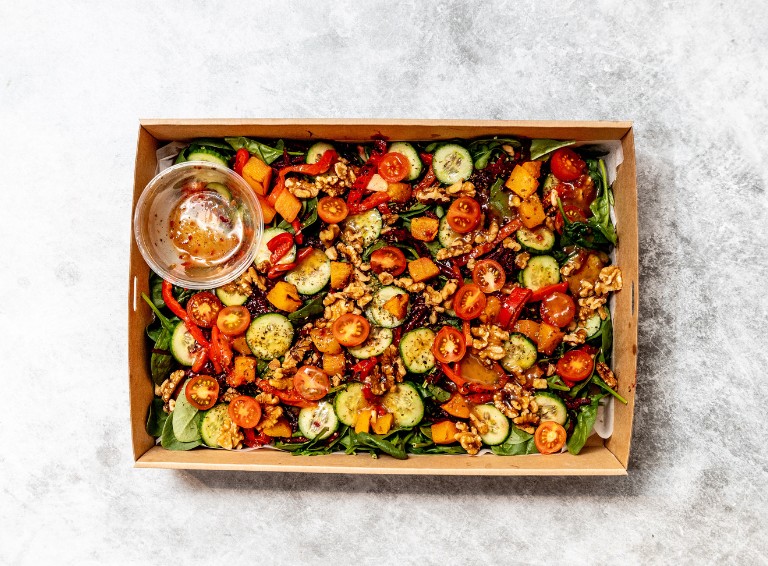 Roasted pumpkin, spinach, kalamata olives, marinated red capsicum, walnuts, cherry tomatoes, cucumber, red onion, oregano topped with a light Italian dressing. -