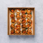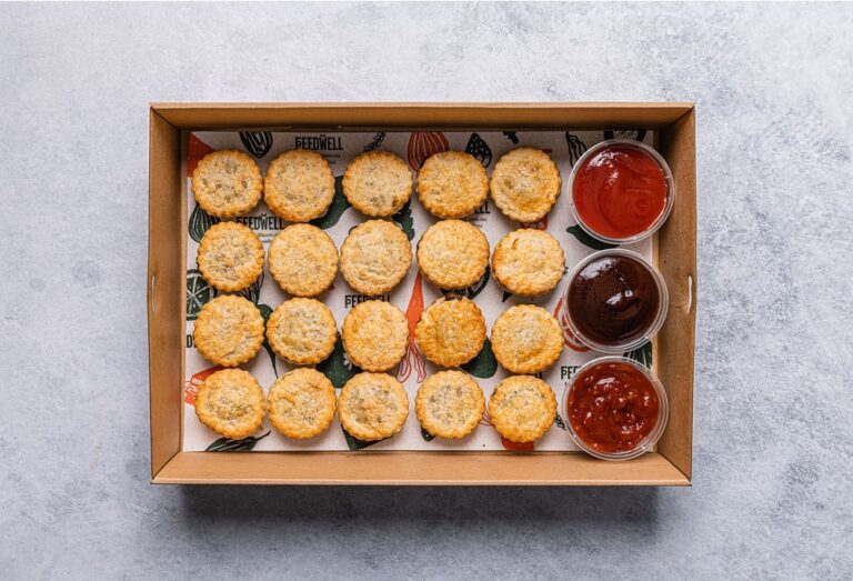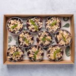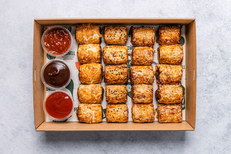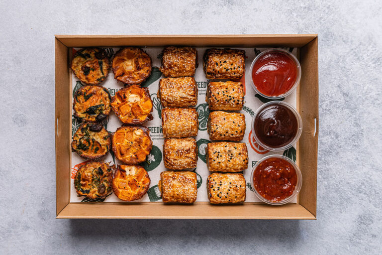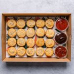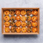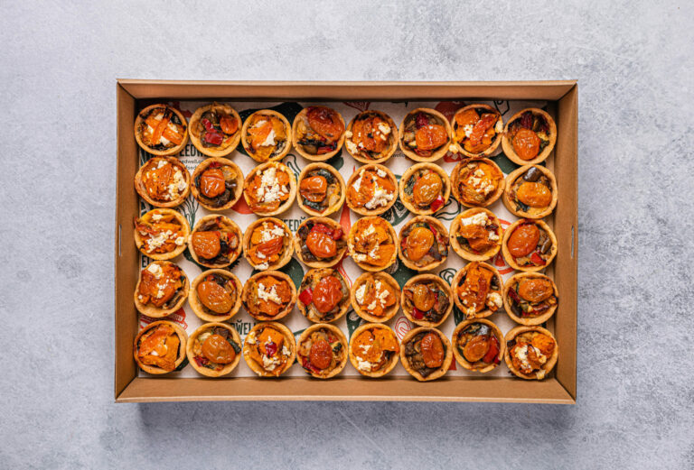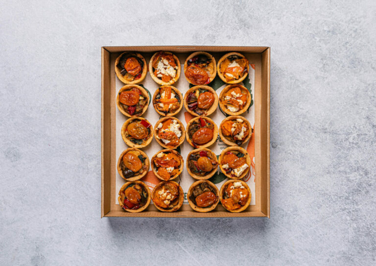 An assortment of 20 freshly baked tartlets. Flavours may include: Ratatouille and Hummus - Vegan Pumpkin, Spinach and Hummus - Vegan Cherry Tomato, Caramelised Onion & Goats Cheese - Veg Pumpkin, Caramelised Onion & Goats Cheese - Veg The flavours included in each box vary depending on availability and in-season ingredients. Delivered cold, ready to eat. -