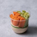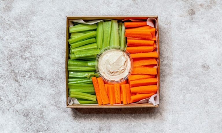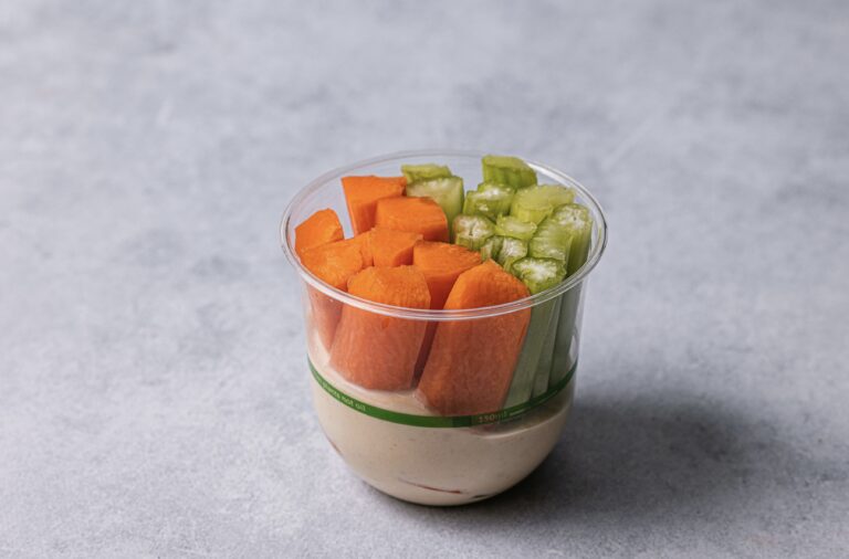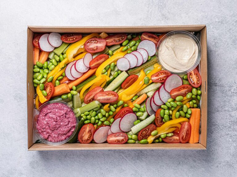 An assortment of freshly cut bite-size veggie sticks and snacks with tahini and beetroot dip and hummus dip. REGULAR: Serves up to 8 people as a side. SMALL: Serves up to 4 people as a side. Image is a size regular. -