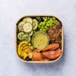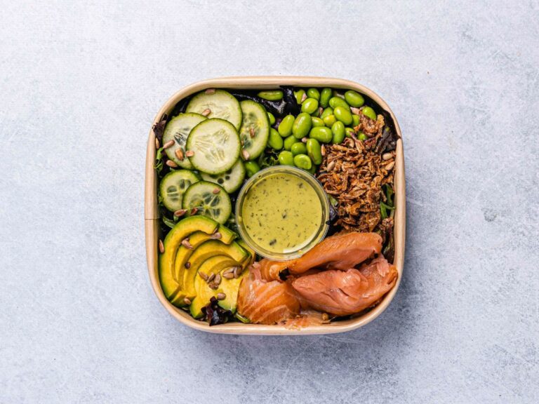 Smoked salmon, cucumber, edamame, avocado, crispy shallots, sunflower seeds, and mixed lettuce with green goddess dressing. -