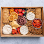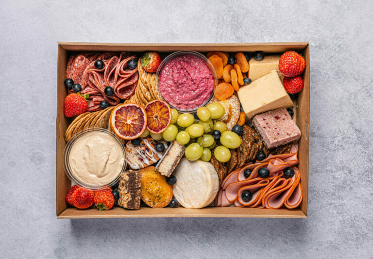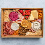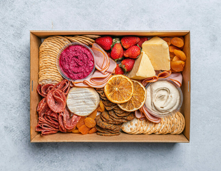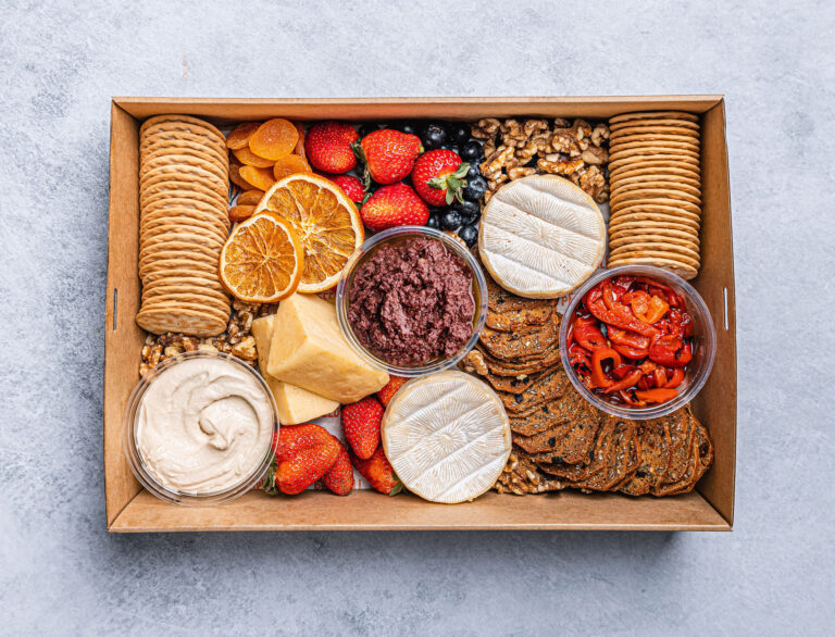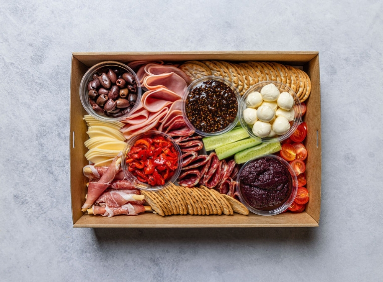 An assortment of Australian cheeses, creamy hummus dip, beetroot and tahini dip, salami, sliced ham, crackers, a selection of fresh fruit, and mixed sweet treats to share. Perfect for office events or home entertaining. Serves up to 8-10 as nibbles.