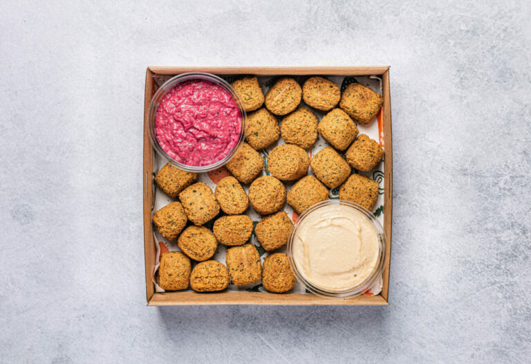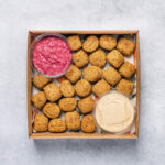 This platter includes: x20 pieces of fresh falafel bites Hummus Dip Beetroot and Tahini Dip Delivered cold, ready to eat. -