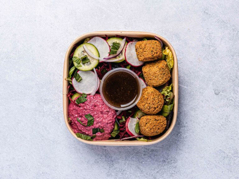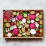 Falafel, shredded beetroot, cucumber, mint, radish, red onion, beetroot tahini dip, and mixed lettuce with balsamic and olive oil vinaigrette dressing. -