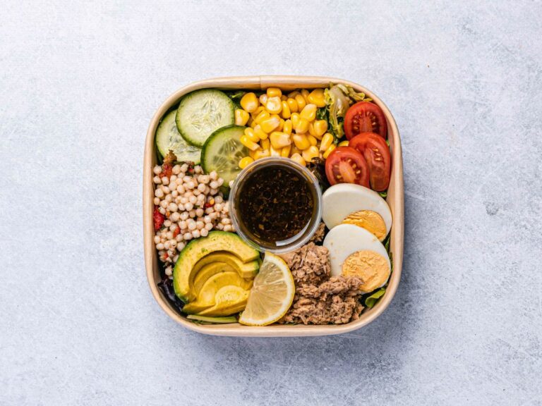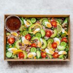 Line-caught tuna, cherry tomatoes, avocado, cucumber, lemons, couscous, boiled egg, sweetcorn, and mixed lettuce with balsamic vinaigrette dressing. REGULAR: Serves up to 10 people as a side. SMALL: Serves up to 4 people as a side. -
