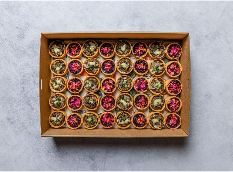 An assortment of 40 freshly baked tartlets. Includes vegan and vegetarian options. Flavours include: Ratatouille and Hummus - Vegan Pumpkin, Spinach and Hummus - Vegan Cherry Tomato, Caramelised Onion -