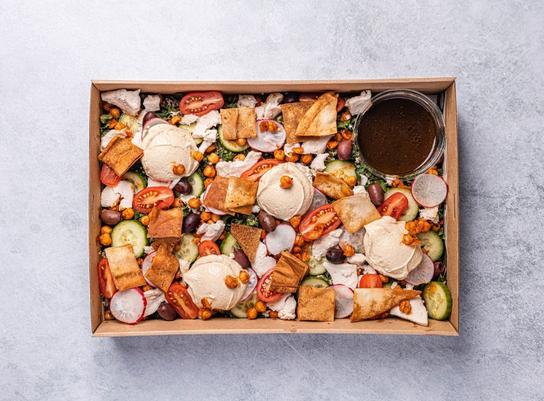 Shredded poached chicken, kalamata olives, marinated spiced chickpeas, cherry tomatoes, Lebanese cucumber, fresh radish, kale, quinoa and crispy Lebanese bread with creamy hummus and a balsamic dressing. REGULAR: Serves up to 10 people as a side. SMALL: Serves up to 4 people as a side. -