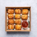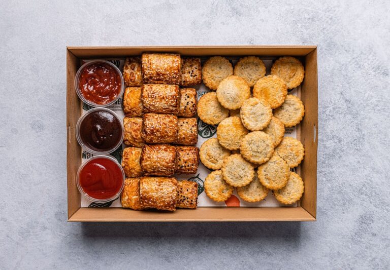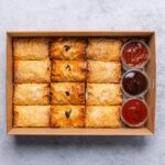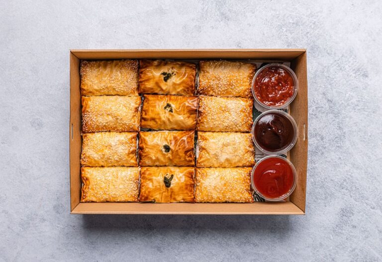 12 freshly baked filo pastries. Includes meat and vegetarian options. Delivered warm.