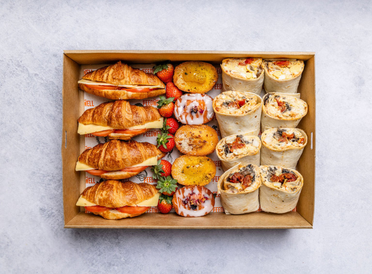 A Sweet and Savoury with something for everyone! Includes: 4 x Vegetarian Breakfast Wraps: Creamy homemade egg mayonnaise, sautéed field mushrooms, and sun-dried tomatoes with a secret relish in a soft white wrap 4 x Cheese and Tomato Croissants 5 x Gluten Free Friands Strawberries Feeds 6-8 -