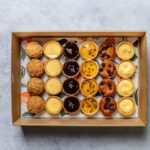 Indulge in an assortment of mini profiteroles featuring choux pastry, creme patissiere filings and ganache toppings. -