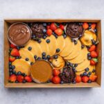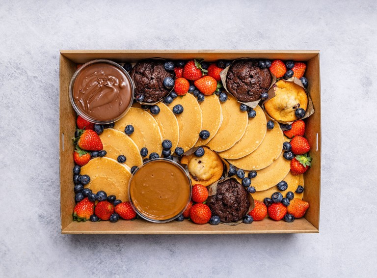 A delicious Pancake Platter with Nutella and Biscoff spreads! Includes: 12 x Small Pancakes 3 x Choc Muffins 2 x Blueberry Muffins 1 x Nutella Spread 1 x Biscoff Spread Finished with an abundance of Strawberries and Blueberries. Serves up to 12. -