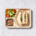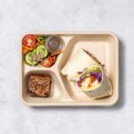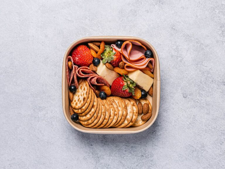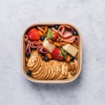 An assortment of deli meats, cheese, crackers, and fruit individually packed in eco-friendly Biopak packaging. -