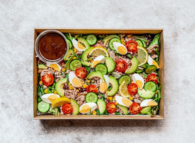 Line-caught tuna, cherry tomatoes, avocado, cucumber, sweetcorn, cous cous, free-range egg, mixed leaves and a lemon wedge, with balsamic vinaigrette dressing. -