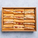 An assortment of our freshly baked and handmade baguettes with quality gourmet fillings. Each person receives one and a half baguettes which translates to 4 pieces per person. -