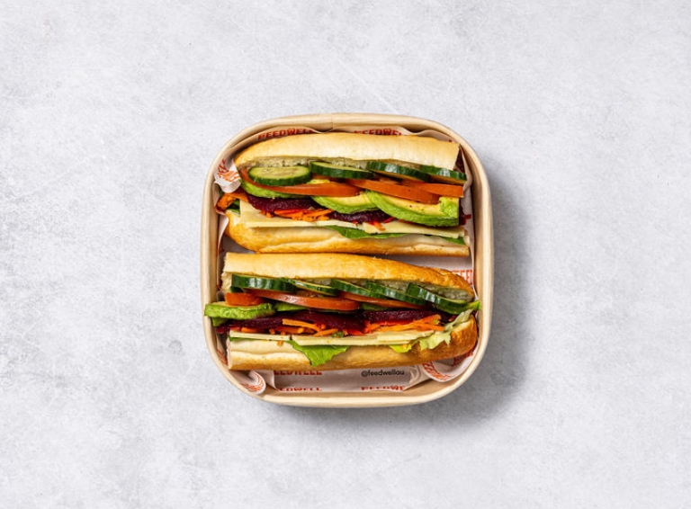 Freshly baked baguette with quality vegetarian fillings, individually packed. -
