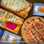 Shared assorted mezze: 15 pieces of Falafels | 10 pieces of Vine Leaves | Choose 3 Dips | 1 tray of Shaved Meat | 4 pieces Turkish Bread | 2 trays Salad of your choice | 1 tray of Rice | 24 pieces of Baklava | and 7 pieces of Gozleme of your choice. -