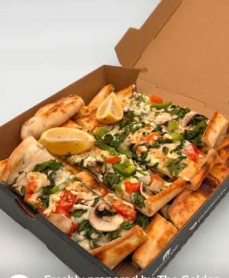 Potato, onion, capsicum, spinach, parsley & vegan cheese. -