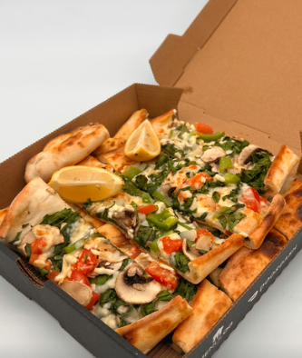 Spinach, mushroom, onion, capsicum, tomato, parsley & vegan cheese. -